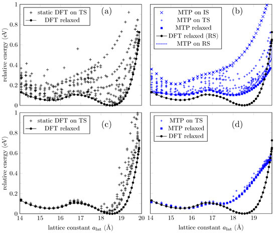 Next, we extract the atomic positions of DFT relaxed configurations (“RS”) to verify if the ML energy prediction agrees with DFT. The ML potential agrees that those are the ground state configurations (“MTP relaxed” and “MTP on RS” curves coincide in Figure 3b), but again the energy prediction is higher around the second phase (see “DFT relaxed” curve in Figure 3b). Still, the ML potential can find the two local minima around the two phases.