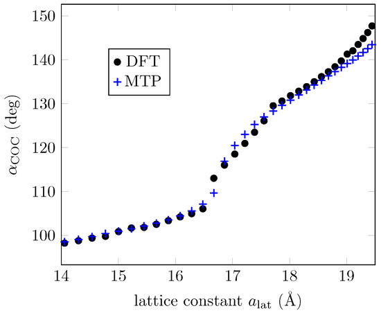 The 41 structures in the IS were used to start the iterative process of selection, training, and relaxation. Convergence tolerance is achieved, and the RMSE of the trained potential is (or per atom). Overall, 395 configurations are generated as the TS, and static DFT results are used to feed the training process. The TS spans over above the ground state configurations, as shown in Figure 3a. We use the trained interatomic potential to reproduce the DFT energies in the TS and to relax the configurations in the IS. Figure 3b gives a better idea of the extent of the accuracy of the trained potential. While it can predict accurately enough for configurations with higher energies, it fails for configurations around the second phase (∼) as the resulting value exceeds the RMSE of the trained potential mentioned earlier in this section. This happens only for the energies around this second phase. Two quantities, the energy and C-O-C angles, obtained with the MTP and DFT for the two minima, are provided in Table 1. It should be emphasized that these data may not be considered as a basic attribute characterizing the model in this case. What is important is that the model can be used to filter structures in the search for candidates to be the ground state, so it is where we can find essential applicability of the ML model. For completeness, in Figure 4 we also present the C-O-C-angles evolution according to DFT, and according to the ML potential used for the 3d graph. Despite the limitations in predicting the energies mentioned above, one can see that the C-O-C-angles of the ground state configurations calculated via MTP are superposed with the DFT results.
