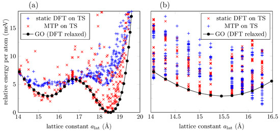 (a) Energy distribution of the TS for a model trained using a cutoff of , according to DFT and MTP. (b) Energy distribution of the TS for a model trained on a restricted range of lattice constant values from to . For comparison, ground state energies, according to DFT calculations, are provided (black marks).