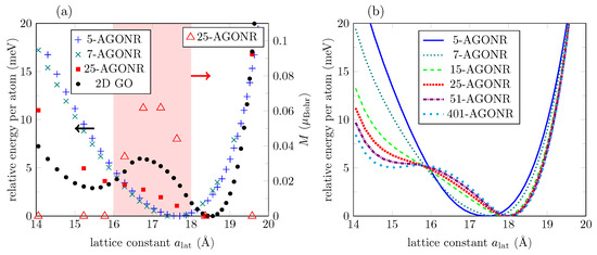Figure 6a displays the evolution of DFT relaxed nanoribbons of different widths compared to the GO layer. While the GO layer has a global minimum at ∼, narrow nanoribbons have a minimum at ∼. However, the global minimum shifts to larger lattice constants for wider nanoribbons, as revealed by the 25-AGONR’s evolution. Additionally, narrow nanoribbons do not present ground state magnetic solutions. This scenario changes for 25-AGONR, in which maximum magnetization is no longer zero, but it is at half range to the maximum magnetization found for the 2D GO (compare triangle marks in Figure 6a and Figure 2a). Finally, Figure 6a shows that while 5- and 7-AGONRs evolve with a very well defined convexity, the 25-AGONR presents a noticeable change in the gradient at around ∼, i.e., the formation of an additional phase begins to take place, although there is no local energy minimum defined yet.