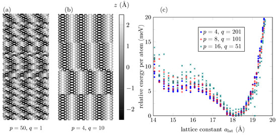 Specifically, we perform spin-polarized DFT calculations to relax the atomic positions at several fixed lattice constants to build the energy vs. lattice constant curve. All of our DFT calculations were performed by using the Quantum ESPRESSO simulation package v.6.8 (see, e.g., [36]), plane-wave basis sets, and ultrasoft pseudopotentials [37], while employing the gradient approximation with the PBE exchange-correlation functional [38]. Our tests of convergence showed optimal values for a wavefunction energy cutoff of and a Monkhorst-Pack k-point grid (periodicity is along the X and Z directions). Here we used an interlayer separation of to ensure a minimum distance of ∼ between atoms, even with a bent structure for the range of lattice constant values considered (from to ).