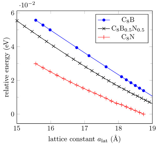 Other realistic configurations include substitutions of oxygen atoms by impurities. We choose boron and nitrogen atoms as substitutes since the valence electrons of B and N together equal to those of a pair of C atoms. It is known that substitution of carbon by boron atoms in an armchair graphene nanoribbon (AGNR) breaks the conjugated electron system, creating a reflective barrier for the -electrons, and can induce magnetized edge states [51]. The ordered oxygen atoms in the disposition shown in Figure 1 also define localized states for which a finite magnetization has been found for an interval of lattice constant values. However, oxygen substitutions by boron or nitrogen atoms destroy the two-phase feature, and hence its shape memory behavior. We include here DFT results for structural optimization for oxygen substitutions either by boron or nitrogen atoms ( or ), or with a boron–nitrogen pair of atoms (). Figure 9 shows the relative energy in each case for different lattice constant values, with bending angles from to (flat system). The two-phase feature displayed by is lost.