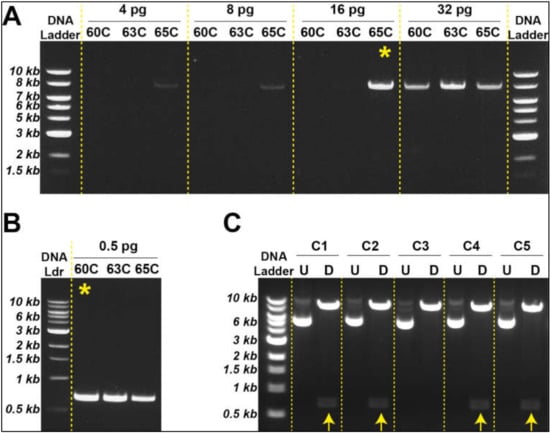 Based on the strategy described above, we generated an empty pLVX vector using different amounts of template plasmid DNA (i.e., pLVX-AmCyan1-C1). Our results suggested that specific DNA amplification can be achieved with as low as 16 pg template DNA at 65 °C (Figure 2A); however, these two parameters can vary from reaction to reaction and should be tested individually. We could similarly amplify the E2-Crimson gene construct using only 500 ng template DNA at 60 °C (Figure 2B). Once specific DNA fragments were digested using XhoI and EcoRI, sticky ends were ligated using T4 DNA ligase (Figure 1D,E) followed by bacterial transformation using heat shock technique (Figure S2A,B). Newly engineered plasmids were extracted from transformed bacteria by miniprep and subjected to restriction digestion with XhoI and EcoRI in order to determine the nature of the ligated DNA products. Four out of five bacteria clones produced the expected sizes of DNA fragments (i.e., 8 kb and 0.7 kb) (Figure 2C). Two of these clones were sequenced to ensure that the insert did not have any mutations that might be introduced during the PCR amplification step (Tables S5 and S6). Once sequencing data confirmed the accurate insertion of the E2-Crimson gene into pLVX vector, we amplified this plasmid construct using midiprep. We repeated this strategy to transfer ZsYellow fluorescent protein gene construct from pZsYellow (Table S4) into pLVX backbone.