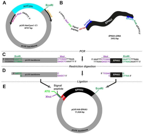 Outline of the molecular cloning strategy to introduce small peptides in wild type genes (A,B). Specific primers were designed to incorporate restriction sites in flanking regions of both vector (pLVX) and insert (EPHA3). HA-tag is added after the 20-aa signal peptide of EPHA3 gene (C). High-fidelity polymerase chain reaction enabled production of linear DNA fragments (D). Restriction digestion with XhoI and EcoRI resulted in complementary sticky ends in the vector and insert (E). Ligation reaction allowed specific fusion of two DNA fragments, yielding a new lentiviral plasmid that carries the HA-tagged EPHA3 gene.