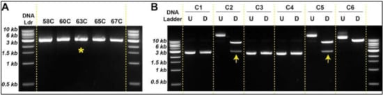 It is important to note that two DNA purification steps were incorporated in the procedures described above. The first one was performed after the PCR experiment before proceeding to the restriction digestion reaction. The second one was performed after the restriction digestion reaction before the ligation reaction (Figure S1). Both purifying procedures were performed in order to remove the excess salt, unused dNTPs, and glycerol that can reduce the efficiency of these enzymatic reactions.