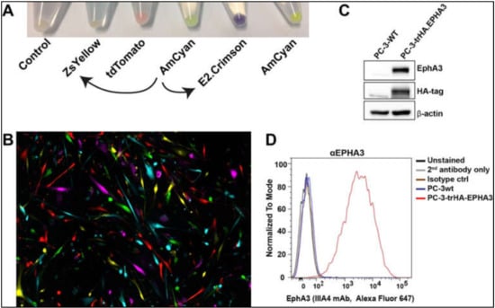 Newly designed lentiviral particles are used in cell tracing and protein labelling (A). Lentiviral particles allowed expression of E2. Crimson and ZsYellow fluorescent proteins. Curved arrows indicate that pLVX-E2. Crimson-C1 and pLVX-ZsYellow-C1 lentiviral plasmids were prepared by using pLVX-AmCyan1-C1 as a vector backbone (B). Chimeric expression of five different fluorescent proteins in tumour cells that are infected with lentiviral particles (C). Lentiviral particles allowed expression of HA-tagged EPHA3 protein in PC-3 cells. The left lane is wild type (wt) PC-3 cells with undetectable EPHA3 and HA-tag expression. The right lane is PC-3 cells infected with HA.EPHA3 lentiviral particles. β-actin was used as a loading control (D). Cell membrane localisation of HA-tagged EPHA3 protein was tested by FACS analysis of nonpermeabilized cells. EPHA3 antibody successfully detected the recombinant EPHA3 protein.
