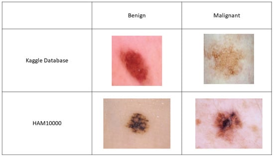 Example of images taken from the Kaggle and HAM10000 databases for classification of benign vs. malignant tumors.