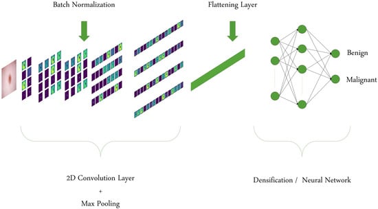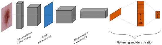 The first Deep Learning (DL) model we consider is a custom Convolutional Neural Network (CNN) model. This type of model is commonly used in image classification thanks to the performance of convolution processes on shape extraction. The custom model is composed of a total of 11 layers. The characteristics of the layers for the custom CNN are summarized in Table 1. A schematic representation of the layout for the custom CNN is provided in Figure 2, and an example of how it processes an image of skin lesion is provided in Figure 3.
