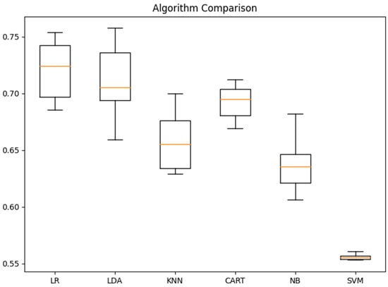 We start by discussing the accuracy of the ML models for the image classification of cancerous skin tumors (see Figure 4). In order of increasing accuracy, we find an accuracy of 63.7%, 65.8%, 68.9%, 71.1%, and 72.1% for GNB, KNN, CART, LDA, and LR, respectively. These results show that linear models tend to provide better performance for the binary task (malignant/benign) involved in skin cancer classification. This, in turn, implies that the features of skin cancer images can be broadly separated into two classes by a straight line. However, the lower performance of the LDA algorithm points to a non-normal distribution of these features, which would not fulfill the assumption required by the LDA model to accurately perform the classification task []. Although the accuracy of a model is, as a general rule, a very good indicator of its performance, medical applications require as few false negatives as possible and, as such, the F-score, as well as other metrics, also need to be examined carefully. We summarize in Table 2 the accuracy, F-score, precision, and recall for each ML model.