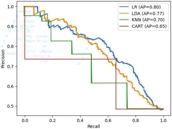 Overall, all ML models are found to exhibit a significant number of false negatives, as shown by the lower values obtained for the recall (all below 0.68) than for the precision, all above 0.73. This is also exhibited by the relatively low values obtained for the F-score, which are all below 0.35. To analyze further the results, we examine the precision-recall curves obtained in this work (see Figure 5). We also evaluate the area under the precision-recall curve for each model. This provides a measure of the sensitivity and performance of the model. The highest area under the curve is obtained for the LR model in line with the results observed for accuracy. Looking at low recalls levels in Figure 5, we find that, for the LR model, the precision remains of 1 for a higher value of r (above 0.1) than for the LDA model (only for r up to 0.05). Furthermore, LR and LDA are the only models that exhibit the maximum precision performance of 100%. Indeed, the other ML models exhibit a maximum precision either close to 95% (KNN) model and under 80% for all other models, even for very low r.