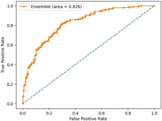 We also compare the ROC curve, as well as the area below the ROC curve (AUC), for each of the ensembles. The ROC curves are similar for all three ensembles, with the maximum AUC obtained for ensemble E2. We show in Figure 6 the ROC curve for ensemble E2, and find areas under the curve of 0.81, 0.83, and 0.81 for ensembles E1, E2, and E3, respectively. This confirms that ensemble models built on linear ML models provide the optimal ML approach for skin cancer prediction models.