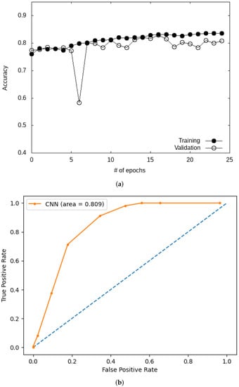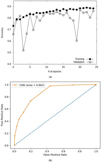 We start by commenting on the results obtained with the custom CNN model. We plot in Figure 7 the variation of the accuracy for the CNN during training. Figure 7 shows an increase in accuracy with the number of epochs for both the training and the validation datasets. The final value reported for the accuracy is 0.83, while other metrics give an F-score, precision, and recall of 0.84, 0.94, and 0.76, respectively (see Table 4). The custom CNN model is found to outperform ML models. The performance of the model is further studied by examining the ROC curve (Figure 7), with a value obtained for the AUC of 0.86. This value is of the same order as those found in previous reports of AUC of about 0.71 obtained on larger datasets [].