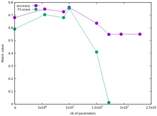 We now turn to the results obtained using pre-trained models. A baseline for the performance of these models can be obtained by carrying out a “Frozen base training”, i.e., by taking the base hyperparameters as they were initially fine-tuned and training the embedding neural network only. The baseline performance so obtained is shown in Table 4, with an accuracy ranging from 0.71 (Xception) to 0.85 (ResNet50) and a F-score ranging from 0.71 (Xception) to 0.85 (ResNet50). Interestingly, ResNet50 performs well without any re-training of the base hyperparameters. The next step consists in unfreezing some of the base layers and re-training the corresponding hyperparameters to achieve maximum performance. This second stage is termed “Fine-tuning training” and requires a systematic study of the impact of fine-tuning the hyperparameters on the metrics. We show in Figure 8 the change in accuracy and F-score as a function of the number of re-trained base parameters during the “Fine-tuning training” step of the ResNet50 model. This plot shows that the performance can be optimized by re-training part of the base layers, and leads to the optimal performance metrics reported in the bottom half of Table 4.