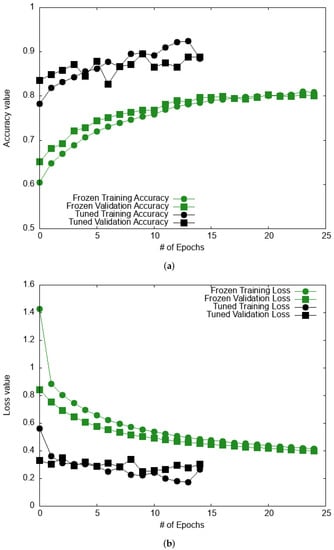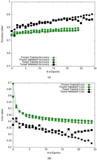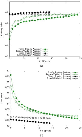 Accuracy and loss evaluation through the number of epochs for the Xception pre-trained model in (a,b), respectively, and for the VGG16 pre-trained model in (c,d), respectively, during the two training stages (“Frozen base training” and “Fine-tuning training”).