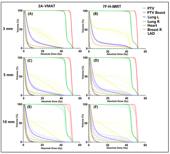 A sample of dose–volume histograms (DVHs) with different position shifts in 2A-VMAT and 7F-H-IMRT plans. (A) 3 mm shift in 2A-VMAT plan; (B) 3 mm shift in 7F-H-IMRT plan; (C) 5 mm shift in 2A-VMAT plan; (D) 5 mm shift in 7F-H-IMRT plan; (E) 10 mm shift in 2A-VMAT plan; (F) 10 mm shift in 7F-H-IMRT plan. PTV, planning target volume; PTV Boost, planning target volume boost; CTV, clinical target volume; CTV Boost, clinical target volume boost; Lung L, left lung; Lung R, right lung; Breast R, right breast. 2A-VMAT, 2-arc volumetric arc modulation radiotherapy; 7F-H-IMRT, 7-field hybrid intensity-modulated radiotherapy.