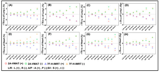 Dose difference between the reference and perturbed 2A-VMAT and 7F-H-IMRT plans for different isocenter shifts. (A) ∆V40 Gy of Lung L; (B) ∆V20 Gy of Lung L; (C) ∆V5 Gy of Lung L; (D) ∆Dmean of Heart; (E) ∆V40 Gy of Heart; (F) ∆V20 Gy of Heart; (G) ∆V5 Gy of Heart; (H) ∆Dmean of Heart. Lung L, left lung. Vy Gy, the volume (in percentage) received by y Gy; Dmean, the mean dose; Dmax, the max dose; 2A-VMAT, 2-arc volumetric arc modulation radiotherapy; 7F-H-IMRT, 7-field hybrid intensity-modulated radiotherapy; L, left; R, right; A, anterior; P, posterior; S, superior; I, inferior.