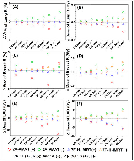 For Lung R, increased ∆V5 Gy (Figure 3A) and ∆Dmean (Figure 3B) were found in the 2A-VMAT plans. ∆V5Gy was sensitive to the L-R direction, while Dmean to the S-I direction. Similarly, both ∆V5Gy (Figure 3C) and ∆Dmean (Figure 3D) of Breast R exhibited discernible sensitivity to the L-R direction shift in the 2A-VMAT plans. The 2A-VMAT plans showed more appreciable dose differences in Dmax (Figure 3E) of LAD. However, no obvious difference was found for Dmean (Figure 3F) of LAD. The shift in S-I induced maximum dose differences in LAD for both the 2A-VMAT and 7F-H-IMRT plans.