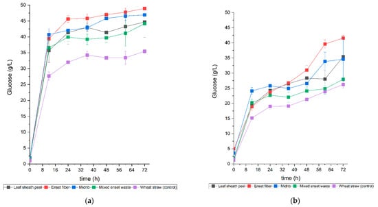 In this study, an enzymatic hydrolysis experiment was performed to evaluate the effect of the dilute alkali or acid pretreatment method on the glucose release from each Enset biomass part. Figure 3 shows the glucose concentration results produced from alkali- or acid-pretreated biomass after enzyme hydrolysis with 5% (dry weight) solid loading. In samples pretreated with alkali (Figure 3a), after 36 h, the Enset fiber contained 45.8 g/L glucose, while in midrib, the same amount of glucose was found after 48 h. A similar amount of glucose (44 g/L) was found in leaf sheath peel and mixed Enset waste after 72 h. However, in samples pretreated with acid (Figure 3b), after 72 h, the Enset fiber glucose level was reduced to 41.5 g/L and the converted glucose from midrib and leaf sheath peel was slightly higher than that of the mixed Enset waste, which was showing as 35 g/L. Overall, 24 h was sufficient to convert 80 to 90% of all alkali-pretreated Enset biomass samples to glucose, while it took 60 h to convert 48 to 80% of the acid-pretreated Enset biomass. One possible explanation could be the influence of the pretreatment process on the structural properties of the Enset biomass. One study showed that despite the enzyme mechanism, various factors influence the enzymatic hydrolysis of lignocellulosic biomass, such as the physical, chemical, and morphological properties of the materials [66]. Zhang et al. [67] investigated the effect of structural features of biomass on enzymatic hydrolysis and found that, in addition to the lignin content, the crystallinity of the biomass was an important factor in reducing the enzyme hydrolysis rate. According to this study, for samples with a low lignin biomass, those with high biomass crystallinity took longer to complete enzymatic hydrolysis than samples with low biomass crystallinity [67]. Even though the lignin content of Enset biomass was low, acid-pretreated samples did not necessarily lose their crystallinity. It is important to conduct several tests on the structural properties of Enset biomass before and after pretreatment to better understand this material. In our research, with both methods, the glucose concentration in all Enset biomass samples was higher than in wheat straw samples (control), except for the acid-pretreated mixed Enset waste hydrolysate, which had a similar concentration to the acid-pretreated wheat straw hydrolysate.