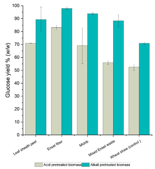 A comparison of the glucose yield for Enset biomass samples pretreated with dilute acid and alkali after 72 h of enzymatic hydrolysis is shown in Figure 4. The percentage of glucose yield was calculated from each pretreated Enset biomass sample. The difference between the acid- and alkali-pretreated Enset fiber and leaf sheath peel yields was less than 20% (w/w). However, in the mixed Enset waste and midrib samples, the alkali-pretreated samples had higher glucose yields by 33% (w/w) and 35% (w/w), respectively, than the acid-pretreated samples. In this study, the alkali pretreatment method released more glucose than the acid method did for all Enset biomass samples; this was due to the compositional differences between each Enset biomass sample. Research has shown that the most effective pretreatment methods vary significantly depending on the type of biomass [66]. The alkali pretreatment method enhances cellulose digestibility, which makes it easier to remove lignin from the biomass than with the acid pretreatment method [68]; several lignocellulosic materials, such as corn stover, switchgrass, and Bermuda grass, have been successfully pretreated in this way [38]. However, the acid pretreatment method is primarily responsible for eliminating hemicellulosic materials from biomass and releasing sugars, such as xylose and arabinose, into the liquid stream [69]. In this study, we observed that between all of the samples, greater monomeric sugars were found in acid-pretreated than in alkali-pretreated liquids (Table S1 in Supplementary Materials), showing that the hemicellulose portion was more strongly solubilized than alkali-pretreated samples. Yet, following the washing process, the monomeric sugars were lost from the acid-pretreated samples. When comparing our findings with those for different biomasses from a previous study under similar alkaline conditions and enzymatic hydrolysis, 44.81 g/L glucose was found in switchgrass [38] and 48.68 g/L glucose in corn cobs [70] after 72 h, values that are comparable to the findings for most Enset biomass samples. This shows that Enset biomass could represent a potential raw material for biobutanol production. However, further investigations should be carried out to optimize the enzymatic hydrolysis process.