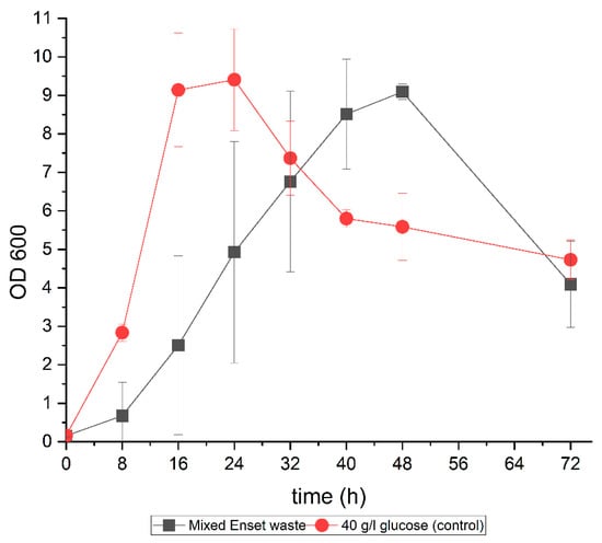 Growth profiles of C. saccharoperbutylacetonicum DSM 14923 during fermentation of mixed Enset waste hydrolysate and pure glucose (40 g/L) as a control.