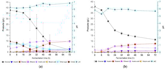 Figure 6 shows the concentrations of ABE fermentation metabolites produced from alkali-pretreated mixed Enset waste hydrolysate and a control medium with 40 g/L glucose using C. saccharoperbutylacetonicum DSM 14923. The sugar consumption varied in fermentation depending on the initial sugar concentration; initially, the hydrolysate medium contained 37.8 g/L glucose, 7.5 g/L other sugars (xylose, mannose, and galactose), and 9.6 g/L citrate for the enzymatic hydrolysis process to maintain the pH. After 72 h of fermentation, only 1.9 g/L glucose and 1.5 g/L other sugar remained unused for the hydrolysate. Furthermore, it was observed in this study that all the citrate was consumed by the strain after 32 h. Similarly, after 72 h, 9.9 g/L butanol, 2.8 g/L acetone, and 1.6 g/L ethanol were obtained, achieving an ABE yield of 0.32 g/g and productivity of 0.2 g/(L h). After 16 h, 0.6 g/L butyric acid was produced, and this reached 1.5 g/L after 32 h. Overall, 3.4 g/L acetic acid was initially present in the hydrolysate medium and this gradually increased to 9.6 g/L after 32 h (Figure 6a). Acetic acid is produced in relatively high amounts, presumably due to the presence of citrate in the medium. It should be noted that after 32 h, the amount of acetic acid produced was quite small. Studies have shown that clostridial fermentation of citrate produces acetate and ethanol as the main products, along with negligible amounts of butanol and acetone [72].