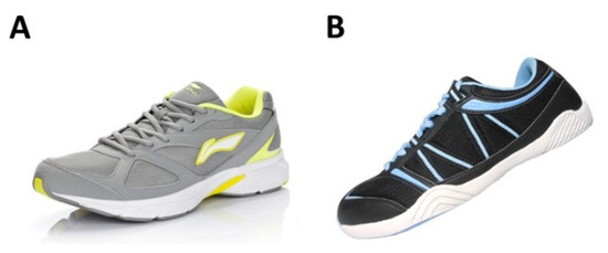 Test footwear: (A) running shoe; (B) jumping shoe.