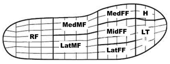 Definition of the plantar pressure regions: H = hallux; LT = lesser toes; MedFF = medial forefoot; MidFF = middle forefoot; LatFF = lateral forefoot; MedMF = medial midfoot; LatMF = lateral midfoot; RF = rearfoot.
