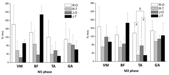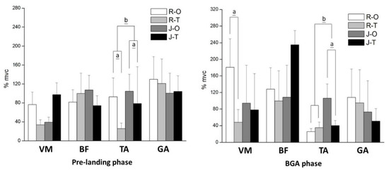 EMG results in different phases. a means significant difference between one- and two-leg landing during jump rope; b means significant difference between running shoe and jumping shoe. R-O = running shoe and one-leg landing; R-T = running shoe and two-leg landing; J-O = jumping shoe and one-leg landing; J-T = jumping shoe and two-leg landing. VM = vastus medialis; BF = biceps femoris; TA = tibialis anterior; GA = gastrocnemius muscle; %mvc = normalized EMG percentage.
