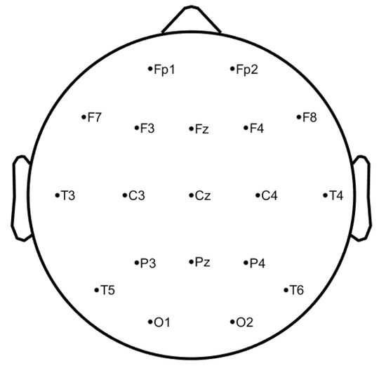 The EEG signals have been collected at Hospital de São João in Porto, Portugal, with the approval of the local ethics committee and the hospital’s administration board within the project CES198-14. The data were acquired at a sampling rate of 256 Hz through 19 electrodes placed on the scalp, using the common reference electrode at CPz, according to the 10–20 system (see Figure 1, image generated by authors in Matlab using EEGLab [20]), covering the frontal (Fz, FP1, FP2, F3, F7), temporal (T7, T8), parietal (Pz, P3, P4, P7, P8, PO7, PO8), occipital (O1, O2), and central (Cz, C3, C4) regions, resulting in 19 waveforms per exam. During the acquisition, it was ensured that all the study subjects were relaxed and with the eyes closed. The DC component was removed. It is important to note that only signals without any kind of artefacts are selected.