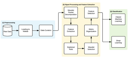 The proposed methodology is divided into three main steps—(1) Preprocessing, (2) Signal Processing and Feature Extraction and (3) Classification. Figure 2 summarizes the methodology implementation steps.