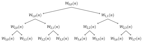 where s is the scale of decomposition (), N corresponds to the signals length, m denotes the position in the tree at scale s (), n are the samples (), and k represents the time (). are the coefficients of the Wavelet Packet at the scale s and position m as can be seen in Figure 3. and are the high-pass and low-pass Wavelet filters, respectively. These filters depend from the selected wavelet [24]. It must be pointed out that is the original normalized signal — , the sub-band signal has its frequency limited in , where is the normalized angular frequency. The filters applied vary according to the mother wavelet family and subfamily [24].