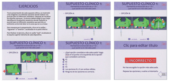 With regard to the methodology used for the objective proposed in this research, and based on the choice of tridimensional images of the jaw previously mentioned, a presentation was designed with hyperlinks in which different clinical situations were envisaged. In this assumed clinical scenario, the student was questioned on the anatomic location for the puncture with a view to achieving effective anaesthesia, which would allow the proposed treatment to be carried out. The student was able to choose the answer from various options and, using the hyperlinks, find out if the answer was correct or not (Figure 3).