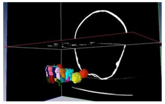 This work finally leads to the creation of a totally interactive three-dimensional structure of the jaw. The following figures demonstrate the evolution in the determination of each one of the elements until the final goal of the total mandibular structure (Figure 5: Temporary teeth, Figure 6: Germs of permanent teeth, Figure 7: Relationship between temporary teeth and permanent germs). Figure 8 shows the final result in a frontal and coronal vision.