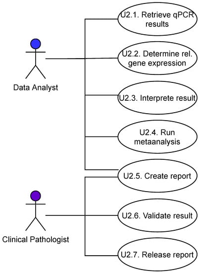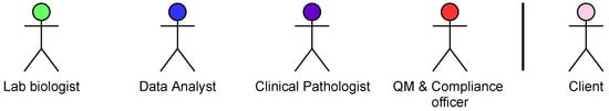 The initial interview facilitated identifying the steps usually taken during the exploratory assay development phase as well as the steps of a routine assay. This classification facilitated limiting the scope of the investigation to use cases being important for the routine assay and to identify user stereotypes for use in the Preliminary Conceptual Model. The principal user stereotypes that have been identified are the Lab Biologist, the Data Analyst, the Clinical Pathologist, a QM & Compliance Officer, and the Client (Figure 4).