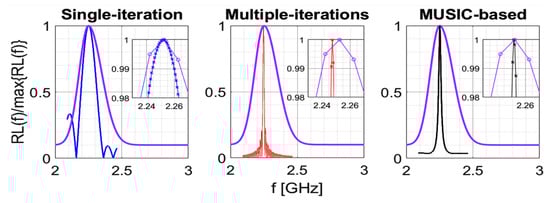 in which is the point of maximum, equal to 2.25 GHz in the current example. The number of samples on the purple curve is equal to . The three algorithms have been implemented by using , , . It can be appreciated that all algorithms provide a tighter final return loss, as compared to the initial one. In particular, taking advantage from the additional steps, the iterative and the MUSIC-based algorithms provide an even tighter final return loss than that given by the single-step algorithm. However, it is even more important to compare the methods in terms of accuracy and precision in the estimation of the resonant frequency. This specific aspect will be discussed in the following section.