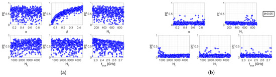 Performance evaluation of the MUSIC-based algorithm: (a) scatter plots between and the various setting parameters, when the latter are all uniform random variables; (b) scatter plots between and the various setting parameters, when and all other parameters are uniform random variables.