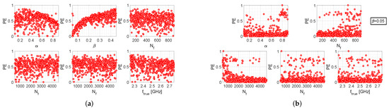 Similar arguments can be made for the results provided by the other two algorithms, which are reported in Figure 3 and Figure 4. However, it should also be noted that the iterative algorithm gives a more modest improvement in the percentage error levels in the fixed- case (Figure 3b), as compared to the other two algorithms. In any case, it can be observed that, for the fixed- case, higher values of are more convenient for all three algorithms, since higher values of are associated with lower values of ; in the other way, which turns out to be counter-intuitive, choosing lower values of (i.e., the number of samples of the return loss acquired by the measurement instrumentation) increases the probability of cutting out higher values of . In conclusion, by comparing the scatter plots of Figure 2b, Figure 3b and Figure 4b, it can be stated that the single-step algorithm is the best-performing one in terms of estimation accuracy of the resonance frequency, since the maximum value of is lower than that achieved with the two other algorithms.