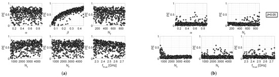 Figure 2a refers to the single-step algorithm and shows six scatter plots, each depicting the percentage error versus one of the parameters, when all other parameters assume uniformly distributed random values. As can be readily noticed, a certain linear relationship exists between and , whereas it does not appear any particular dependence on the other parameters. It can just be observed that for higher values of the maximum value of decreases almost linearly, which is reasonable as is defined. However, such a dependence is not as pronounced as the one between and .