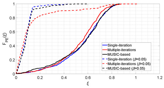 Dashed lines in Figure 5 represent the fixed- cases, summarizing what is seen in Figure 2b, Figure 3b and Figure 4b. As it can be appreciated, these lines are shifted to the left with respect to the solid ones, which indicates that parameter assumes lower values, and therefore more accurate estimates are provided. Furthermore, the dashed lines distributions also show a faster growth rate than the solid ones, which therefore means less dispersion of the observations, and therefore higher precision. As a matter of fact, in the fixed- case the 5th percentile is obtained at for all three algorithms. Regarding the 95th percentile, with the single-step and the MUSIC-based algorithms, it stays around , whereas with the iterative algorithm it is close to , which is coherent with the result shown in Figure 3b.