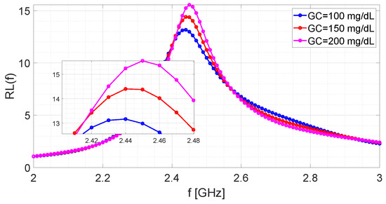 Figure 7 shows the return losses provided by the microwave sensor in correspondence to three different values of the glucose concentration (). The number of samples, equispaced in the band GHz, is equal to . Consequently, the frequency sampling step is fixed to MHz.