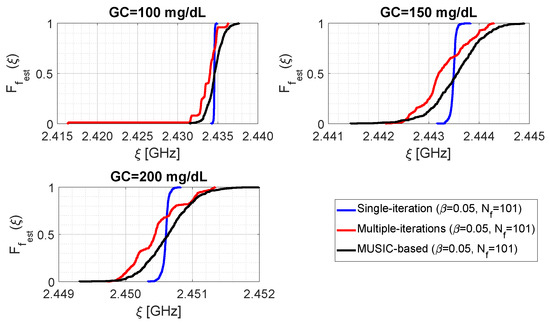 Figure 8 shows the distributions of parameter for the three examined algorithms at different glucose concentrations. The distributions are obtained under the settings , , and generating the other parameters as random uniform variables in the ranges , and . As it can be seen, the single-step algorithm provides less dispersed data, and is therefore equipped with greater precision, since the blue lines are more “vertical” than the others. Furthermore, it can be observed that for mg/dL the distribution related to the iterative algorithm (red line) shows a long left tail, due to the presence of some outliers around GHz. By looking at Table 1, it can be recognised that although MUSIC-based algorithm presents almost the same dispersion as the multiple-iteration one (for example, in terms of difference between the 5th and 95th percentiles), both procedures give a value of approximately in correspondence of the same value of of the single-step algorithm. Accordingly, the single-step and the MUSIC-based algorithms provide approximately the same median for parameter ; the same situation does not hold for the iterative algorithm. Furthermore, another interesting consideration is that the sample mean and the sample median are almost coincident for each individual case (e.g., referring to Table 1, for mg/dL the single-step algorithm gives GHz). By comparing data shown in Figure 7 with those of Figure 8 and Table 1, it can be intuitively concluded that parameter provides a good estimate of the resonance frequency, and the difference is definitely lower than the initial sampling step MHz. Finally, for the assumed cases, no distribution associated with a given value overlaps with another one associated with a different (for example, the black curve related to mg/dL reaches its maximum value before GHz, while the black curve related to mg/dL presents values greater than zero after GHz).