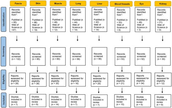 A substantial literature search was conducted to review the literature from 1960 through October 2021. Two electronic databases, i.e., PubMed and Web of Science were used to identify all relevant English publications without any category restriction. The MeSH keywords used were: “hyaluronan aggregation”, “hyaluronic acid aggregation”, “hyaluronan densification” and “stiffness”. The search was extended through the reference lists of the recruited texts. Relevant secondary references were also captured. The authors looked for papers discussing hyaluronan aggregation and stiffness in different extra-articular anatomical structures. Different organs and tissues were found including liver, kidney, eyes, skin, blood vessels, lung, muscle and fascia. Two reviewers (CP and NP) independently selected the articles by reading the titles and abstracts. A third reviewer (AS) finalized the selection in case of disagreement. After the selection, each title/abstract/full text was independently evaluated by each of the authors. The following data were recorded; any discrepancies were resolved by agreement among the authors. The flowchart of the study is shown in Figure 1.