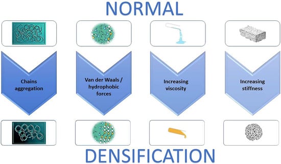 The biological process of densification development. Hyaluronan increases in concentration, then aggregates, releasing water. This process generates a macromolecular structure that increase the viscosity of the extracellular matrix consequently increasing tissue stiffness.