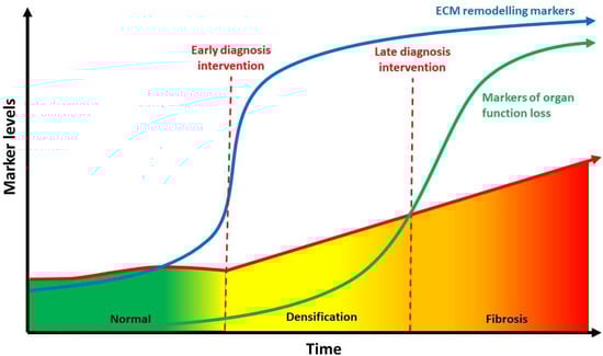Relationship between hyaluronan concentration (indirect evaluated through ECM), densification and fibrosis over time. Biomarkers of ECM remodeling may identify molecular processes occurring in the early phases of densification, giving the opportunity for early intervention when the disease is still reversible before fibrosis sets in. ECM: extracellular matrix (Modified from []).