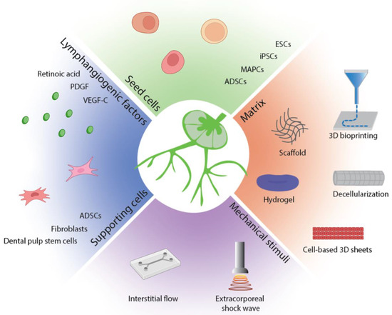 Stem cells are characterized by their capacity for self-renewal and multilineage differentiation. Based on their differentiation potential, stem cells are divided into totipotent, pluripotent, multipotent, oligopotent, and unipotent stem cells [10]. Totipotent stem cells refer to zygote and blastomeres which can form all the cell types in a body and the placenta. The pluripotent stem cells include embryonic stem cells (ESC) and induced pluripotent stem cells (iPSCs) that can give rise to all the cell types that make up the body. Multipotent stem cells are found in most tissues and differentiate into cells from a single germ layer. Mesenchymal stem cells (MSCs) are the most recognized multipotent stem cells that can be derived from a variety of tissue including bone marrow, adipose tissue, bone, Wharton’s jelly, umbilical cord blood, and peripheral blood. These cells tend to turn into mesoderm-derived tissue such as adipose tissue, bone, cartilage, and muscle. Oligopotent stem cells can self-renew and form two or more lineages within a specific tissue. Hematopoietic stem cells are a typical example of oligopotent stem cells, as they can differentiate into both myeloid and lymphoid lineages. Unipotent stem cells can self-renew and differentiate into only one specific cell type and form a single lineage. The purpose of this part is to summarize stem cell based lymphatic tissue bioengineering.
