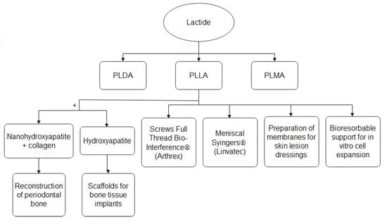 | L-lactide/DL-lactide | L-lactide with ε-caprolactone and hydroxyapatite | Composite materials for bone reconstruction | [104] |