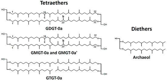 - Schouten, S.; Hopmans, E.C.; Sinninghe Damsté, J.S. The organic geochemistry of glycerol dialkyl glycerol tetraether lipids: A review. Org. Geochem. 2013, 54, 19–61. [Google Scholar] [CrossRef]