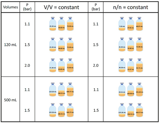 Quadruplicates of each volume and pressure variant were applied with an additional zero control to each experimental set for the 117 mL experiments. Due to logistic reasons, the experiments performed with the 570 mL flasks were performed in triplicates without zero controls. Inoculation was done in an anaerobic chamber (Coy Laboratory Products, Grass Lake, MI, USA) from a cultivated inoculum in defined media (Section 2.2). The residual CH4 was interchanged with a H2/CO2 (4:1 ratio, 99.995% purity (Air Liquide, Schwechat, Austria)) gas mixture twice per day with different pressure values adjusted to 1.1, 1.5, or 2 bar. The pressure is given as bar relative to atmospheric pressure throughout this study. The experimental conditions and settings are detailed in Figure 2 (and Table S1), which shows an overview of the gas phase pressure values and the volumetric (V/V) and molar (n/n) constant alternatives. For the experiments termed as V/V = const, the initial liquid volume was constant with varying pressure (1.1, 1.5, 2.0 bar) within the 117 mL (25.3, 50.6, 75.9 mL) and 570 mL (123.3, 246.5, and 369.8 mL) settings, respectively. Note that the volumetric ratios between the liquid and gaseous phase in the 117 mL and 570 mL bottles are the same for the V/V = const. setting. In contrast, for the n/n = const. settings, the aim was to have the same initial number of moles of the gas phase in three different pressure settings (treated as ideal gas at room temperature, 22 °C). These three settings were defined by the number of moles at 1.5 bar in the 117 mL bottles, at 25.3, 50.6, and 75.9 mL initial volumes. The different starting volumes of the experiments performed at different pressure values were then calculated according to the ideal gas law. For better readability, we refer in further text to the small, medium, and large volumes in the 117 mL or 570 mL bottles at the conditions V/V = const. or n/n = const. The experiments in the 117 mL setting were conducted twice at two different incubation intervals and total times.