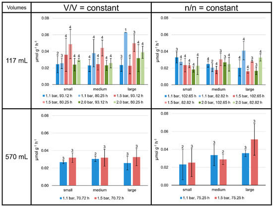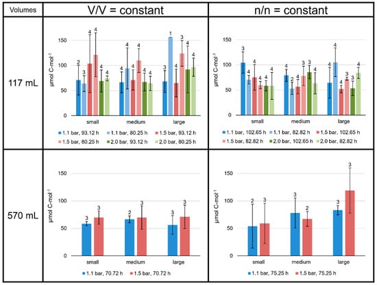The total lipid production rates and yields at V/V = const./1.1 bar were very similar in the 117 mL bottles grown for 93.12 h to those grown in 570 mL bottles for 70.72 h (dark blue bars at V/V = const. in Figure 3 and Figure 4). The experiments conducted at 1.5 bar did not result in such similar outcomes.