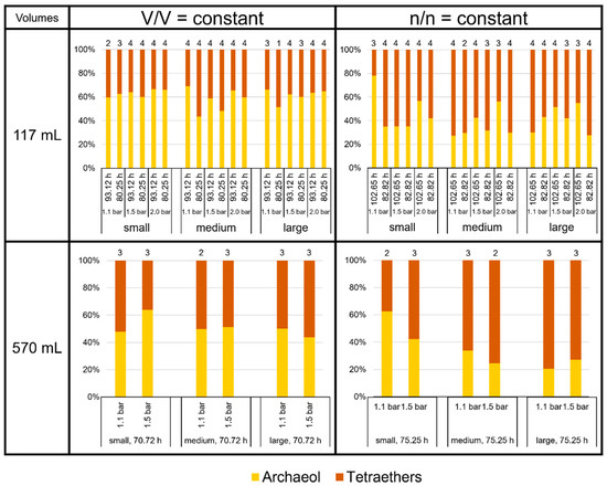 The focus of this study was to investigate the quality and product ratio of the produced core lipids. We found that archaeol and the tetraether lipids together made up more than 99% of total lipids in M. marburgensis. The proportion of the GDDs in this study was, in general, below 0.2%, but it reached about 0.5% of total lipids at large volumes at V/V = const./1.5 bar/80.25 h and about 0.3% at large volumes at n/n = const./2.0 bar/102.65 h in the 117 mL bottles. The relative amount of archaeol varied between 20% (570 mL bottles, large volumes at n/n = const./1.1 bar/75.25 h) and almost 80% (117 mL bottles, small volumes at n/n = const./1.1 bar/102.65 h). On average, M. marburgensis produced about 50% tetraether lipids, depending on the culture conditions (Figure 5). At V/V = const., tetraether lipids comprised 39 ± 4%, whereas at n/n = const., they made up 59 ± 8% in the 117 mL bottles. In the 570 mL bottles, they constituted 49% at V/V = const. and even 65% at n/n = const. Thus, the condition n/n = const. overall led to a higher proportion of tetraethers vs. archaeol compared to V/V = const., where archaeol was the most abundant membrane lipid. However, this ratio relied on pressure and incubation time as well, as the high proportions of archaeol in the smaller volumes at n/n = const./1.1 bar clearly demonstrate (Figure 5).